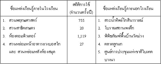 แหล่งเรียนรู้ภายในโรงเรียน (นอกจากห้องสมุด) และแหล่งเรียนรู้ภายนอกห้องเรียนพร้อมทั้งสถิติการใช้